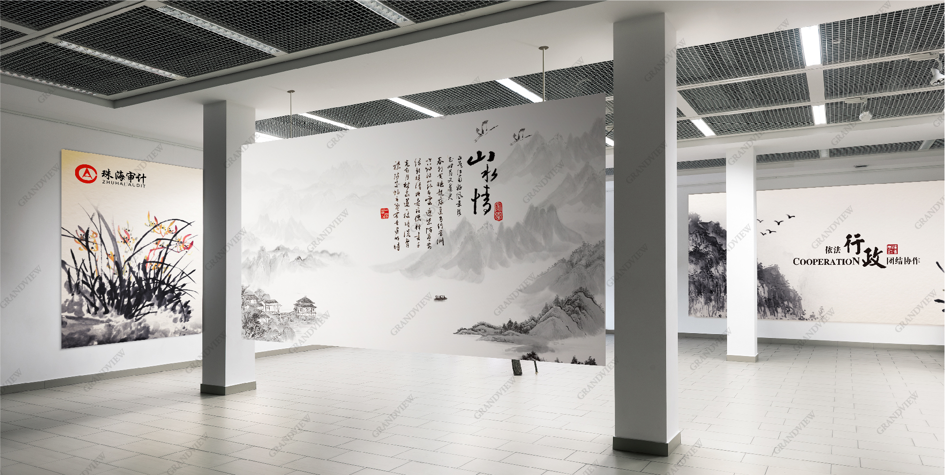 當看到一幅極具人文古韻的水墨畫時,為珠海市審計局與藝術聯結點苦苦尋覓無果的廣角設計師茅塞頓開。于是著力于對民族的審美意識和審美心理的把握,站在珠海市審計局的角度進行綜合設計。